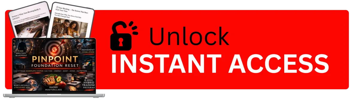 The full Time Mastery Blueprint (3-Block Framework, Block & Buffer Method, Audit → Assign → Adjust system, and nervous system regulation tools), plus 4 bonuses — the 8-Week Hybrid Strength & Hypertrophy Program, the Movement Challenge, the Macronutrient Masterclass, and the Macro Calculator. Instant digital access.